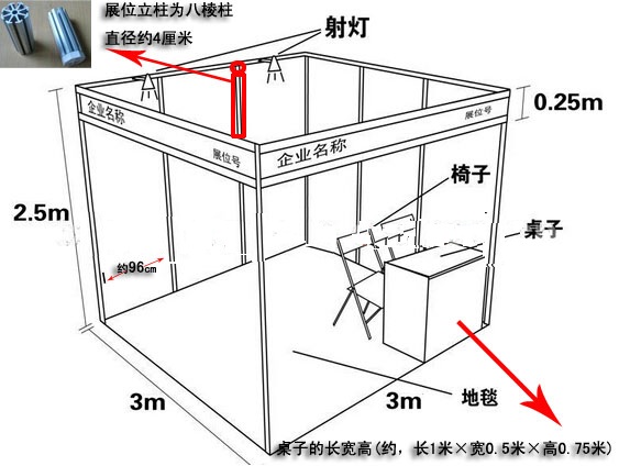 9平米標準展位是展會上最常見的展覽攤位,攤位長寬各3米,高度2.5米左右,攤位一般有主辦方負責搭建,